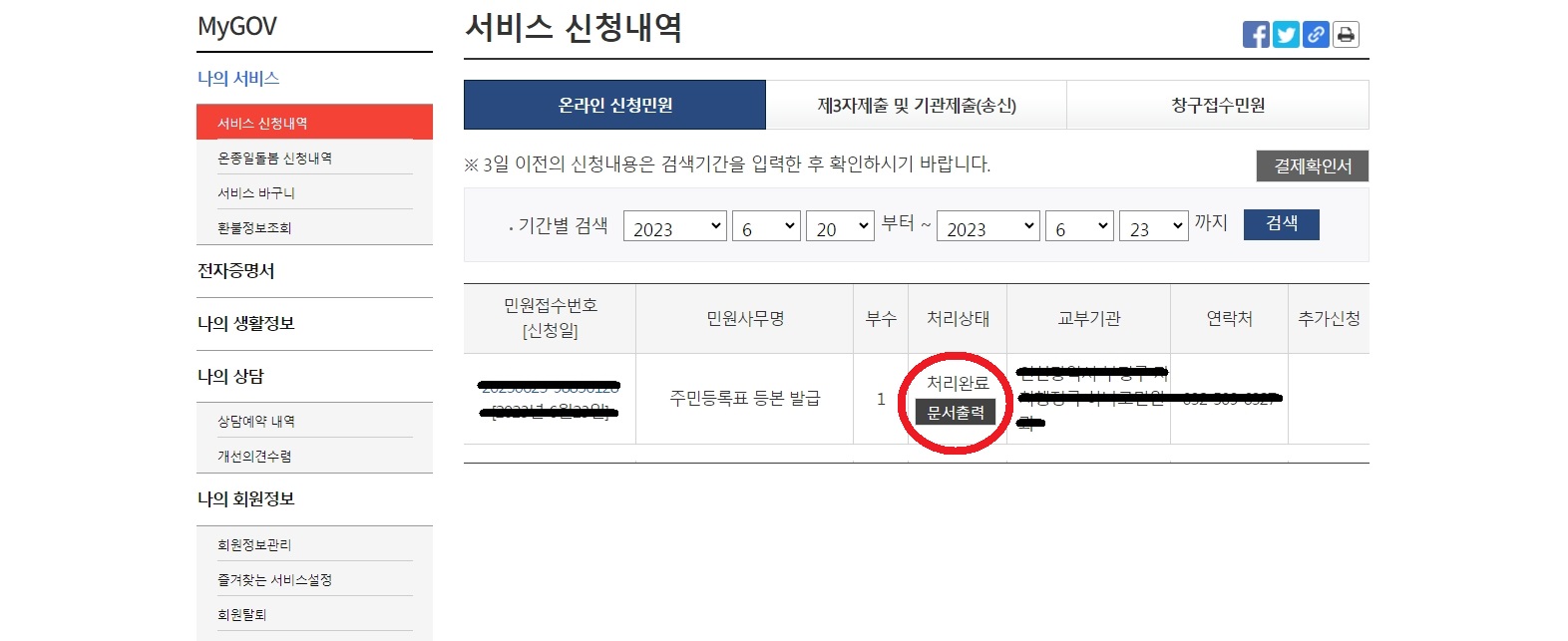 처리상태가 처리완료로 잘 되있죠? 문서출력을 클릭해주세요.