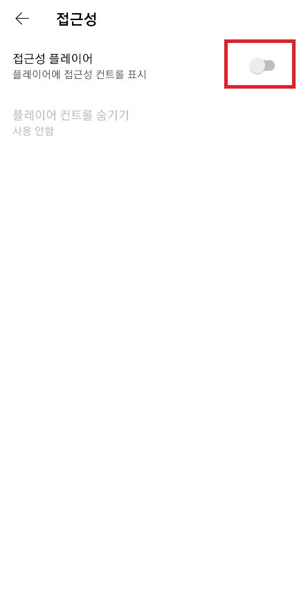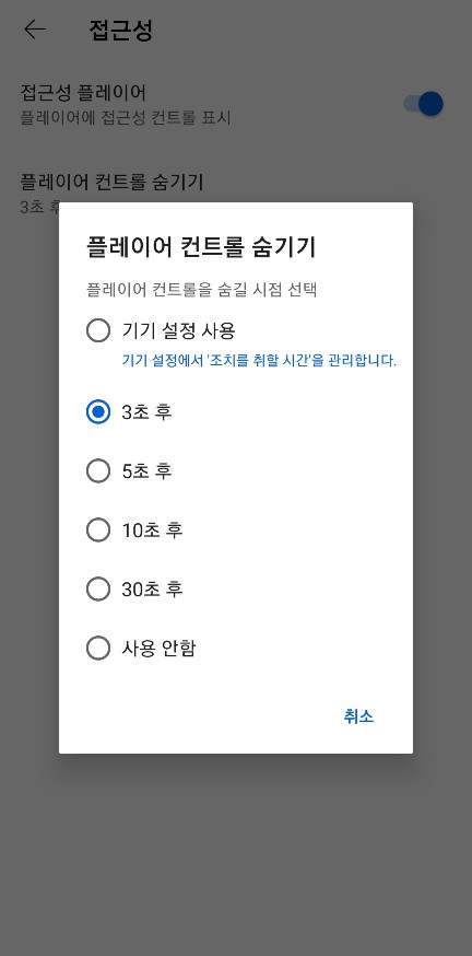 그리고 접근성에 들어가주세요. 그러면 접근성 플레이어를 활성화하는 버튼이 나옵니다. 활성화를 해주신 뒤 플레이어 컨트롤 숨기기 버튼을 눌러서 원하시는 시간을 선택하시면 됩니다.